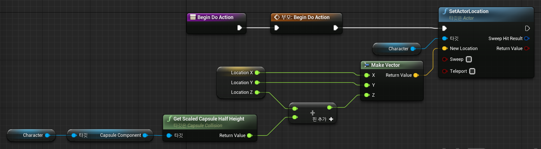 작성한 블루프린트에서는 캐릭터의 크기가 커지거나 작아질 수 있으므로 Scaled Capsule Half Height 함수를 사용하였다.
