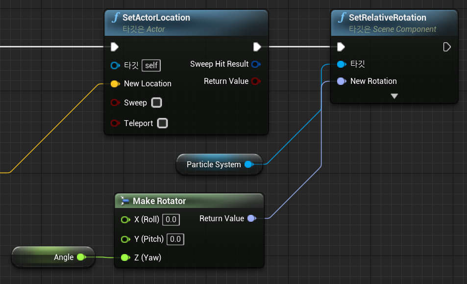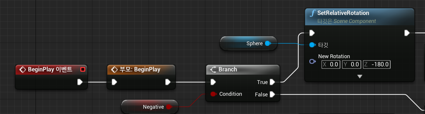 이때 Negative변수의 값이 True여서 마법볼이 반시계방향으로 회전하면 z축이 반전되어있는것처럼 보이기 때문에 블루프린트 클래스가 실행될 때 Negative 변수값에 따라 z축을 반전시킬지 아닐지 미리 연산하고 Relative Rotation을 설정해주었다. 이처럼 Set Relative Rotation 함수는 프로그램의 초기 방향을 설정하는 데 유용하게 사용된다.