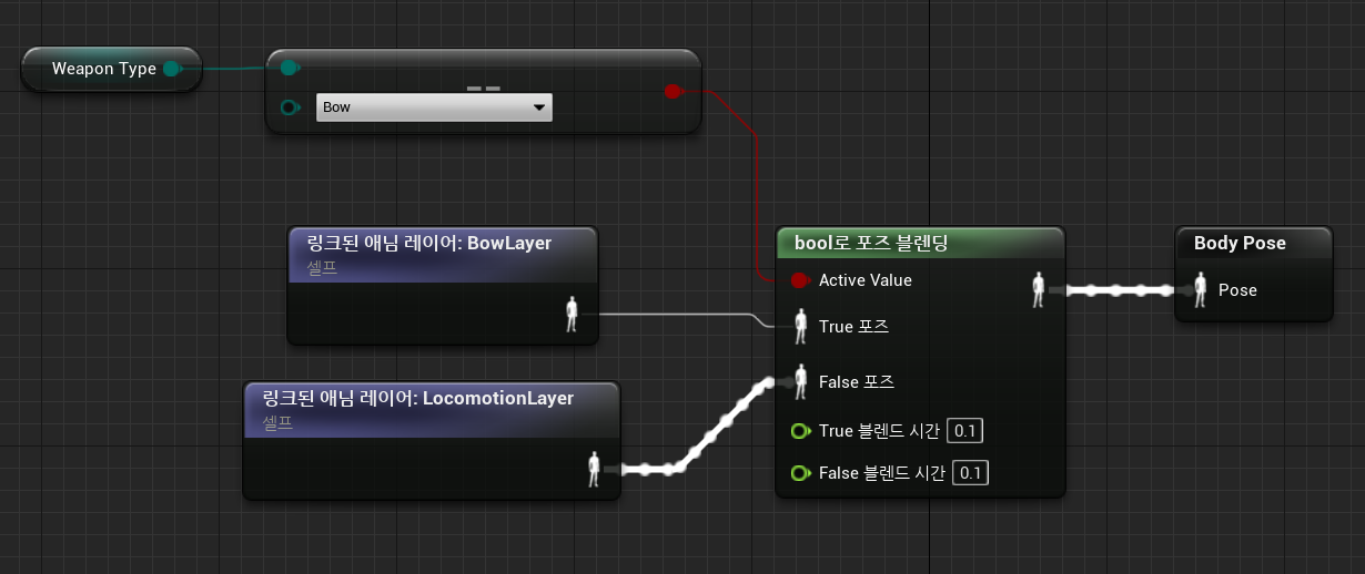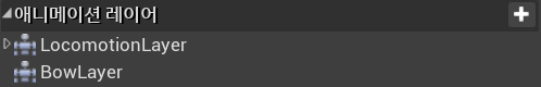 애니메이션 블루프린트에서 기본적인 행동(Locomotion)을 담는 레이어와, 화살 공격 기능(Bow Layer)을 담는 레이어를 추가해주었다.