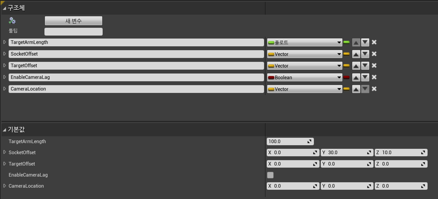 즉, 에임모드일 땐 Aim Data의 속성들로 Spring Arm과 Camera를 초기화하고, 에임모드가 아닐 땐 Origin 변수의 속성들로 초기화해주면 된다.