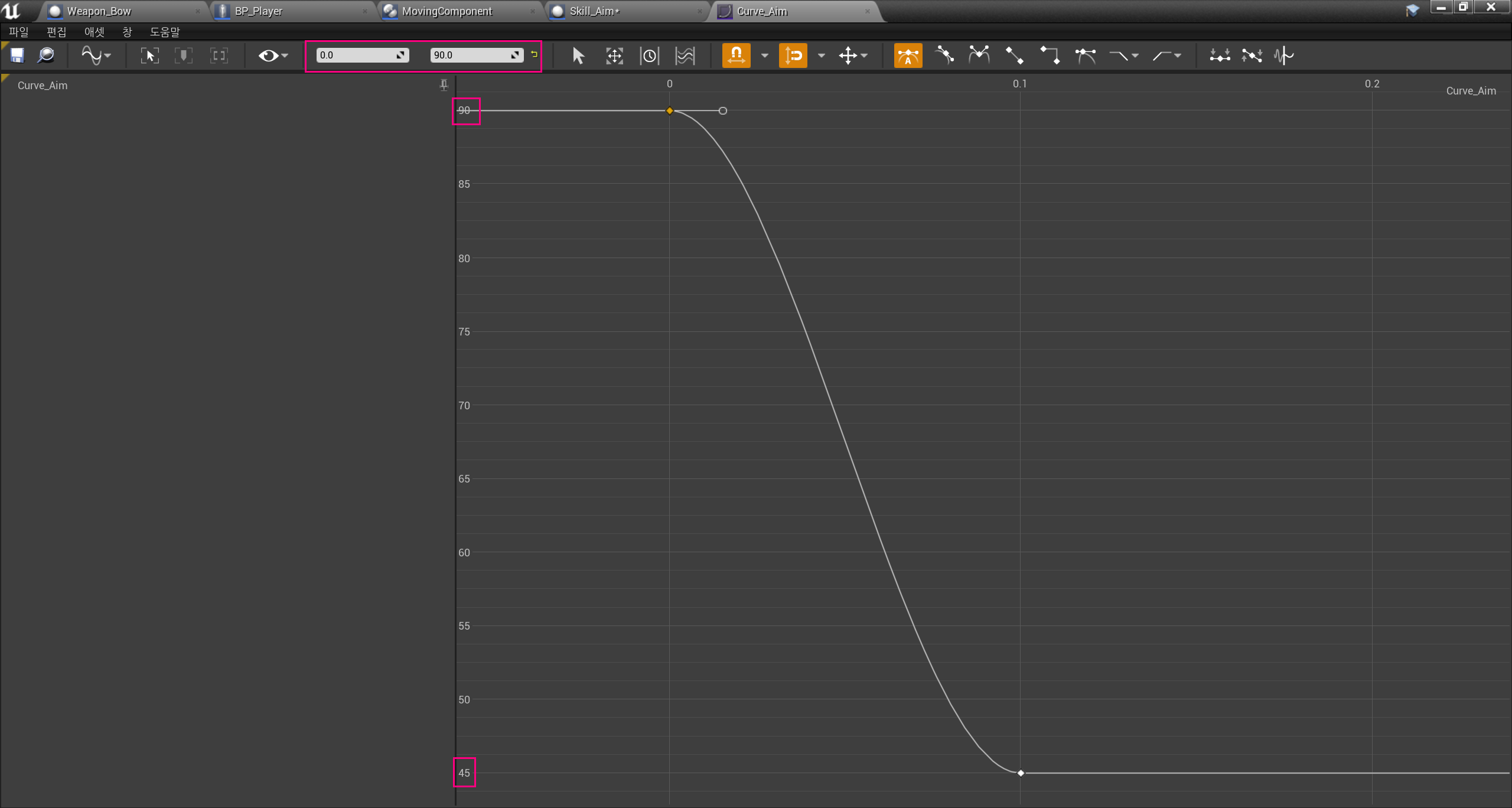 에임모드를 구현은 완료 했는데, 시점이 바뀌면서 화면이 너무 갑자기 확대되고 갑자기 축소되는 현상을 완화시키기 위해 커브를 사용하였다.