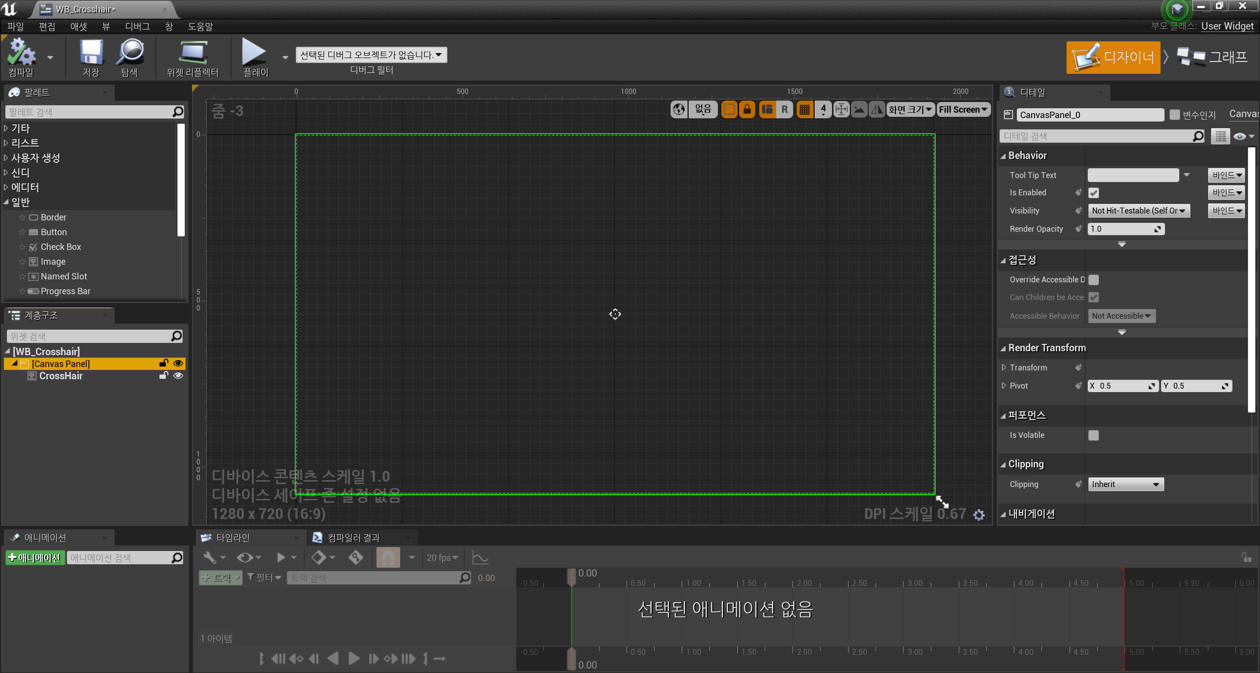 활 조준 상태에서 활이 날아갈 중앙 위치를 조준하는 Crosshair 이미지를 UI로 띄워주기 위해 위젯 블루프린트를 생성하였다.