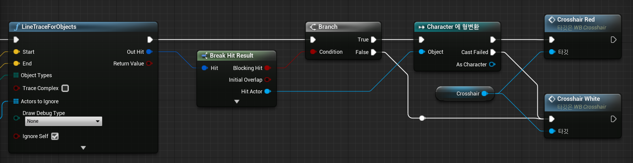 추적 선분에 액터가 충돌되면 조준점(Crosshair)를 빨간색으로 변경하고, 아니라면 흰색으로 변경하였다.