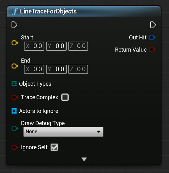 LineTraceForObjects 함수는 지정한 직선상에 콜리전 트레이스를 수행하여 트레이스에 걸린 것 중 지정된 Object Type 중 하나에 일치하는 첫 번째 오브젝트를 반환한다.