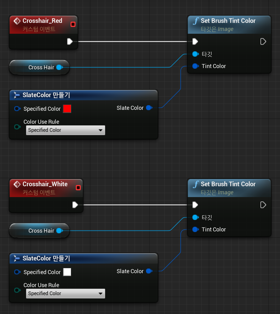 조준점이 타겟을 조준했을땐 빨간색으로 변하고, 조준하지 못하는 일반 상태에선 흰색으로 변하도록 구현하기 위해 위젯 블루프린트의 그래프에 들어가서 색상을 변경시킬 커스텀 이벤트를 각각 만들어주었다.