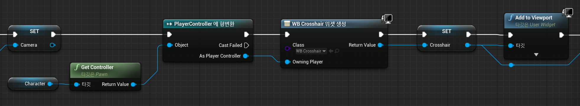 위젯 생성 함수를 호출하여 만든 위젯 블루프린트를 연결하고 같은 클래스 타입인 액터를 변수에 저장해두었다.