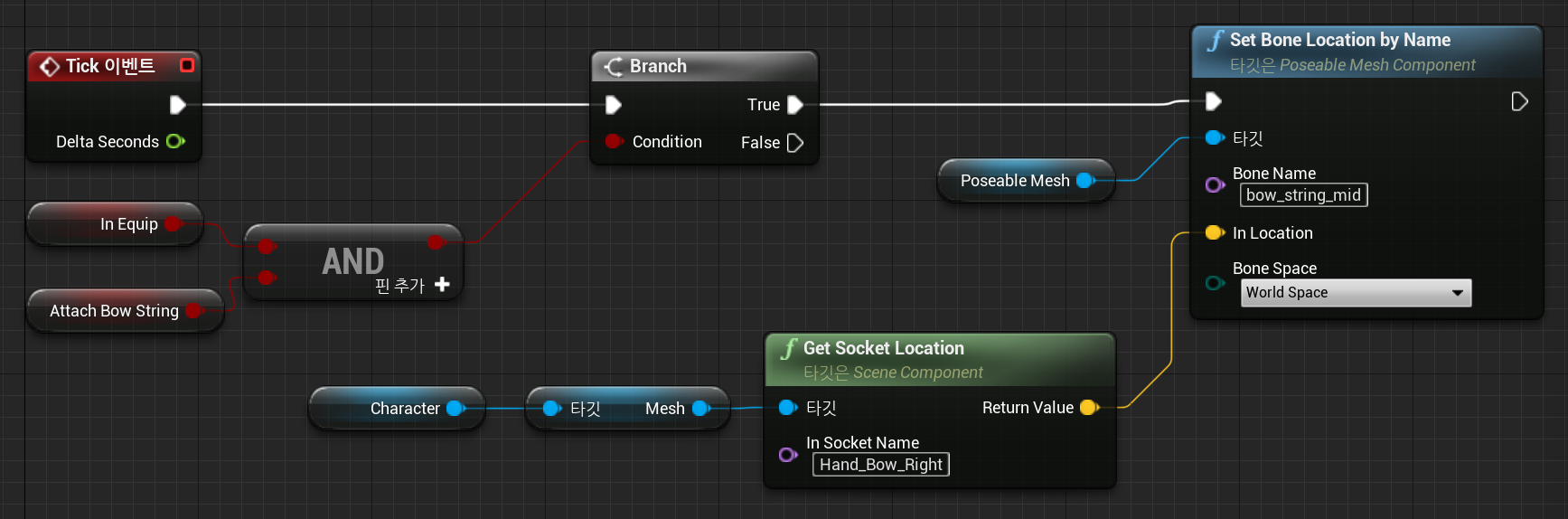 Tick 이벤트가 호출되면서 현재 활을 장착하고 있다면(In Equip), 그리고 활시위가 붙어있는 상태라면(Attach Bow String) 활시위의 Bone 위치를 캐릭터의 오른손 위치에 붙여준다.