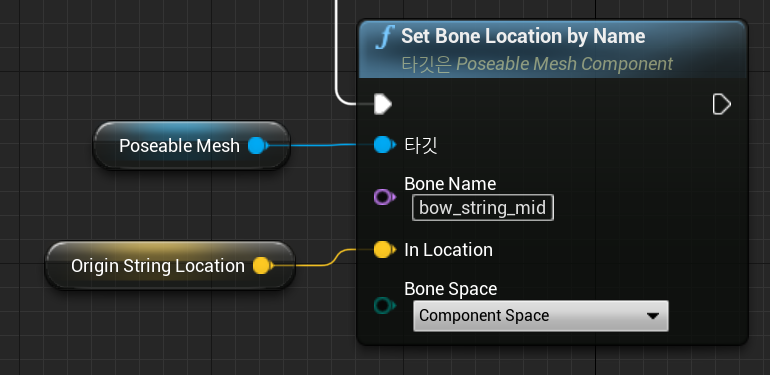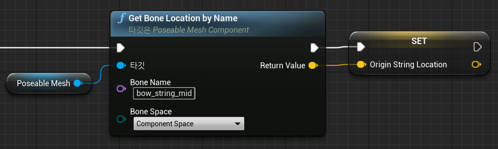 활 액터의 Begin Play가 실행되면 Poseable Mseh의 Get Bone Location by Name 함수를 이용하여 현재 활시위의 Origin 위치를 저장해놓는다.