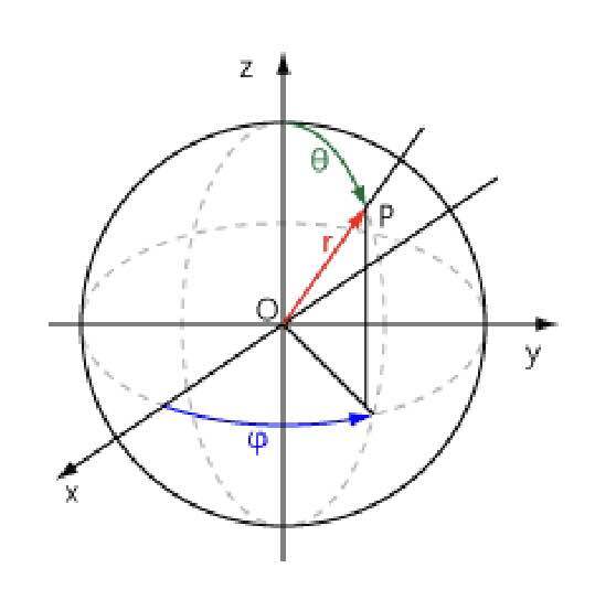 3차원 공간을 나타내기 위해, 원점에서의 거리(r), 양의 방향의 z축과 이루는 각도(θ), z축을 축으로 양의 방향의 x축과 이루는 각(φ)을 이용하여 나타낸다.
