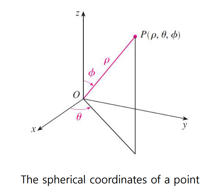 좌표의 특성 상 여러 좌표가 한 점을 나타낼 수 있기 때문에 r은 0 보다 크거나 같고, 세타와 파이의 범위 또한 지정해놓는다.