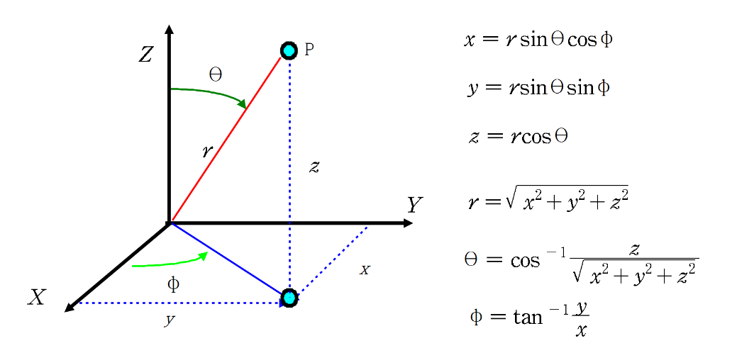 위 사진은 직각 좌표계와 구면 좌표계를 함께 표현한 그림으로 두 좌표계의 관계를 확인해볼 수 있다.