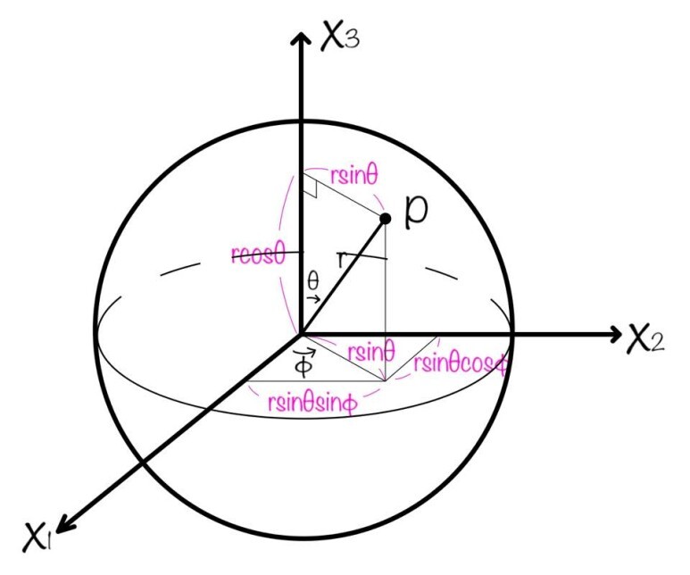 구면 좌표계 (r, θ, φ)와 직각 좌표계 (x1, x2, x3) 사이의 변환식은 위와 같다.
