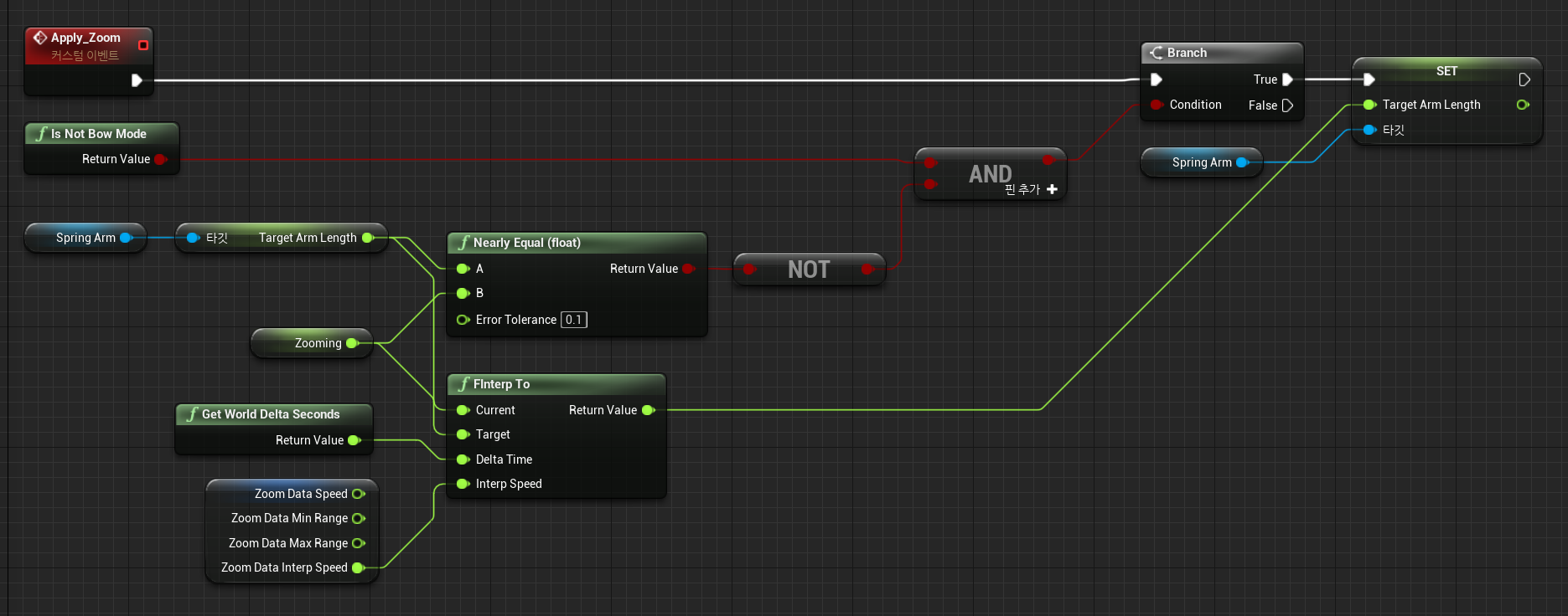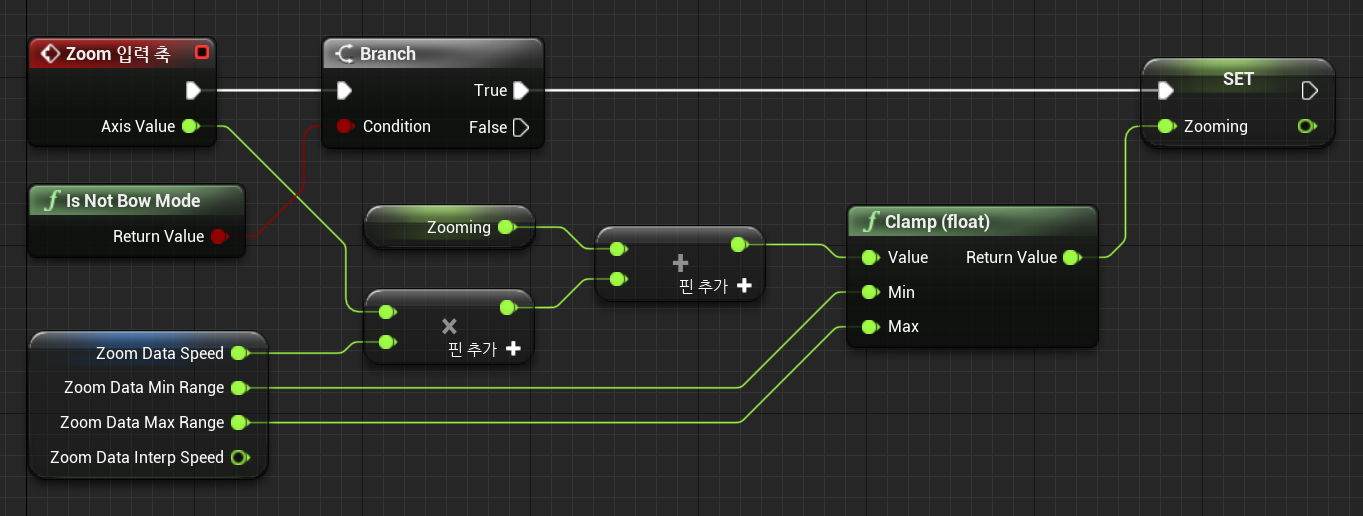 Zoom 입력값이 들어오면 우선 플레이어의 무기가 활(Bow)인지를 검사하고, 활이 아닌 경우에만 줌 기능을 사용할 수 있도록 하였다. (활은 에임모드가 존재하기 때문)