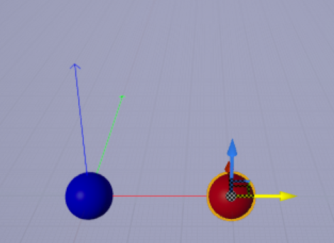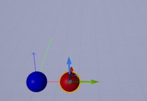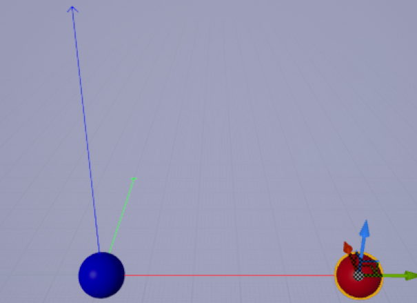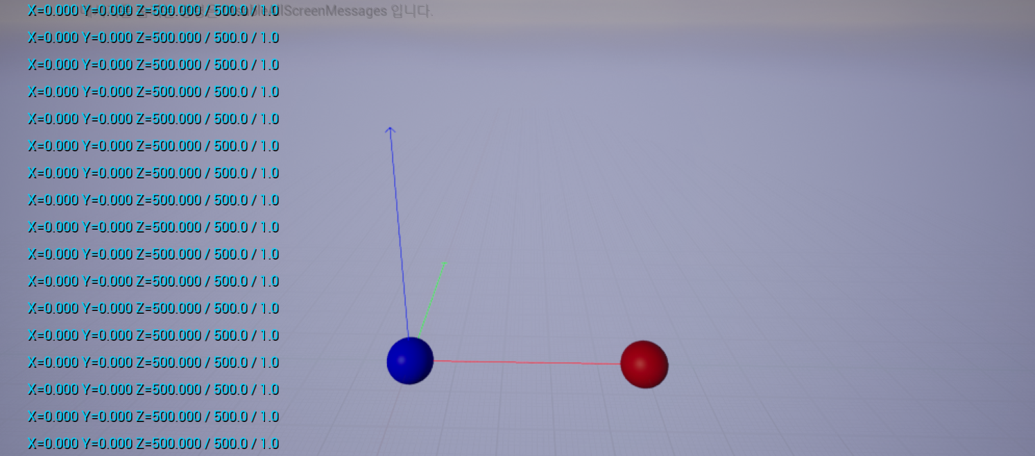 원점(0, 0, 0)에 위치하는 파란색 스피어 액터를 배치하고, 그로부터 y값이 500만큼 떨어진 위치에 빨간 스피어를 놓았다.