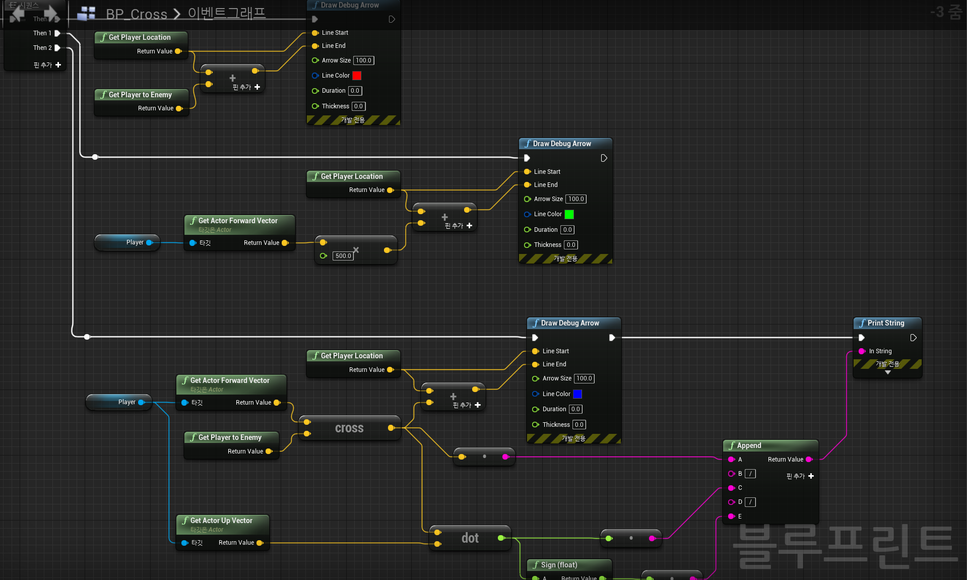 플레이어를 파란액터로 설정하고, Enemy를 빨간액터로 설정하여, 예제 블루프린트가 실행되면 플레이어와 Enemy의 외적 결과를 벡터 라인으로 출력하게 하였다.