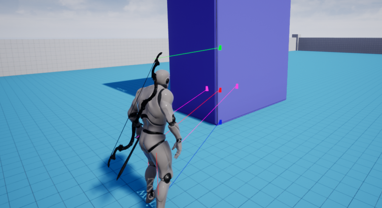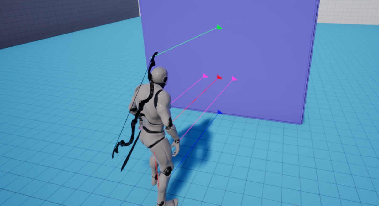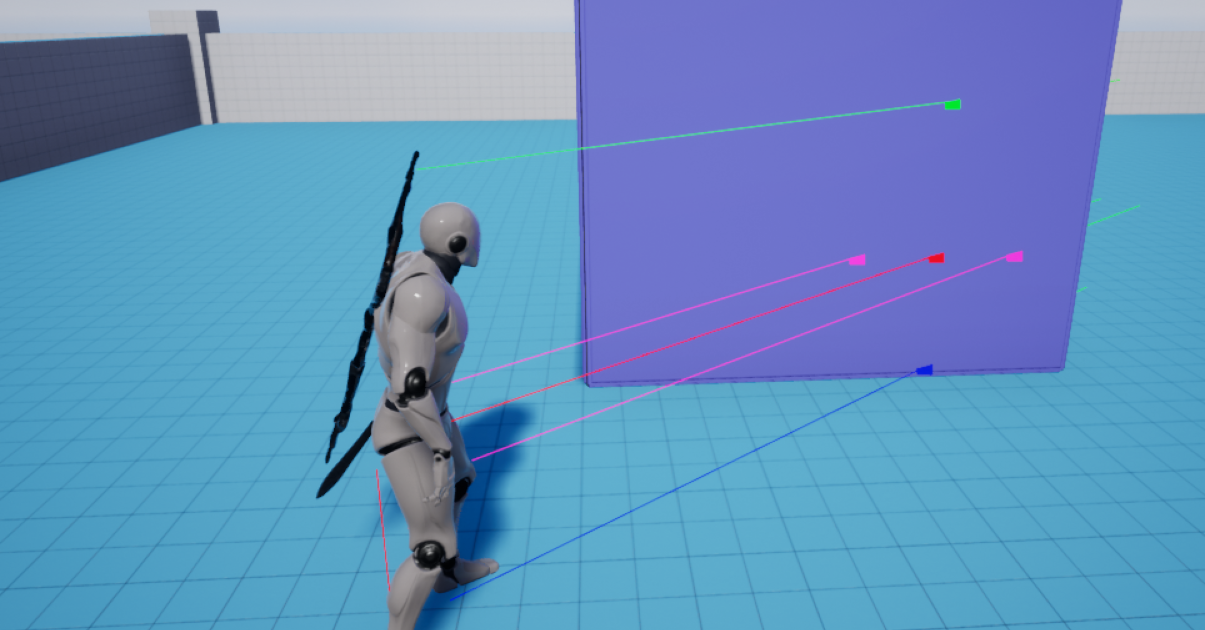 플레이어가 Center, Left, Right의 Arrow들로 Line을 쐈을 때 장애물의 평면앞에 서있다면 세 개의 Line이 전부 일치하게 나올것이다. 반면, 장애물의 모서리에 위치한다면 세 개의 Line이 다르게 나올것이다.