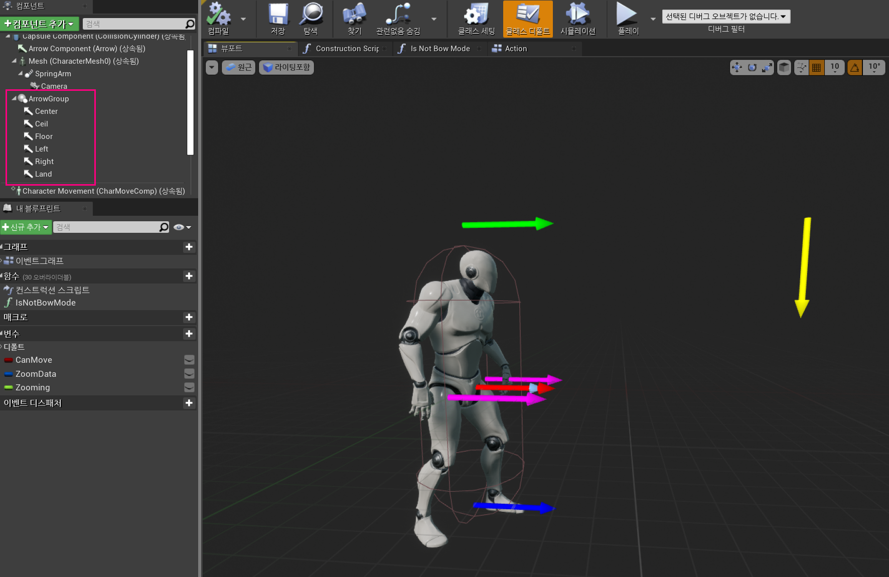 각 화살표의 종류는 열거형(Enum)으로도 전부 생성해두었다. 이때 열거형과 캐릭터의 컴포넌트에 추가한 Arrow 순서를 동일하게 맞추어 Hit Results 배열에 인덱스가 열거형 인덱스와 동일하여 Integer 값만으로도 배열을 사용할 수 있게 구성하였다.