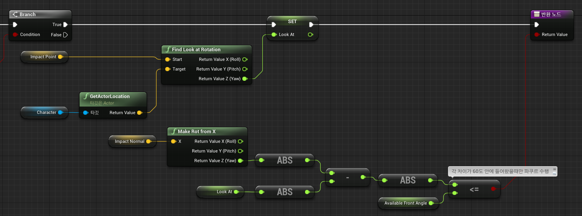 플레이어가 장애물을 바라보는 각도를 Look At 변수에 저장하고, 장애물의 Impact Normal 벡터와 Look At 값에 각각 절댓값(ABS)으로 변환한 뒤 빼면 두 각의 차이가 나온다. 이 각의 절댓값이 Available Front Angle(60도) 보다 작은 경우에만 파크루가 가능한 True 결과를 함수의 반환값으로 주었다.