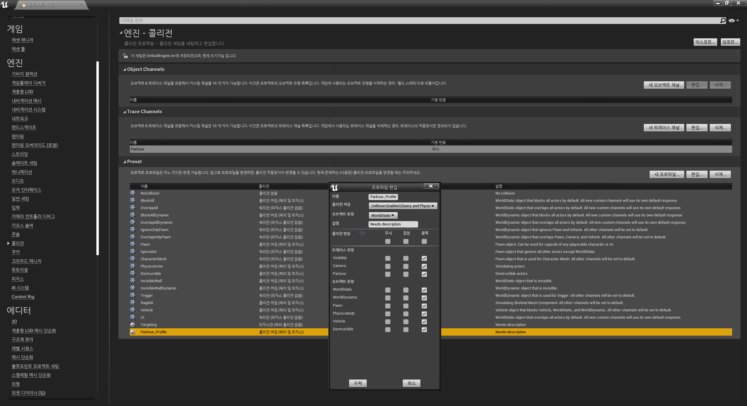 Parkour 라는 이름으로 Trace Channels을 생성하고 기본 반응을 무시(Ignore)로 설정한 뒤, Parkour_Profile 이라는 이름으로 새 프로파일을 만든 뒤, 해당 프로파일만 Parkour를 블록 충돌 하도록 설정하였다.