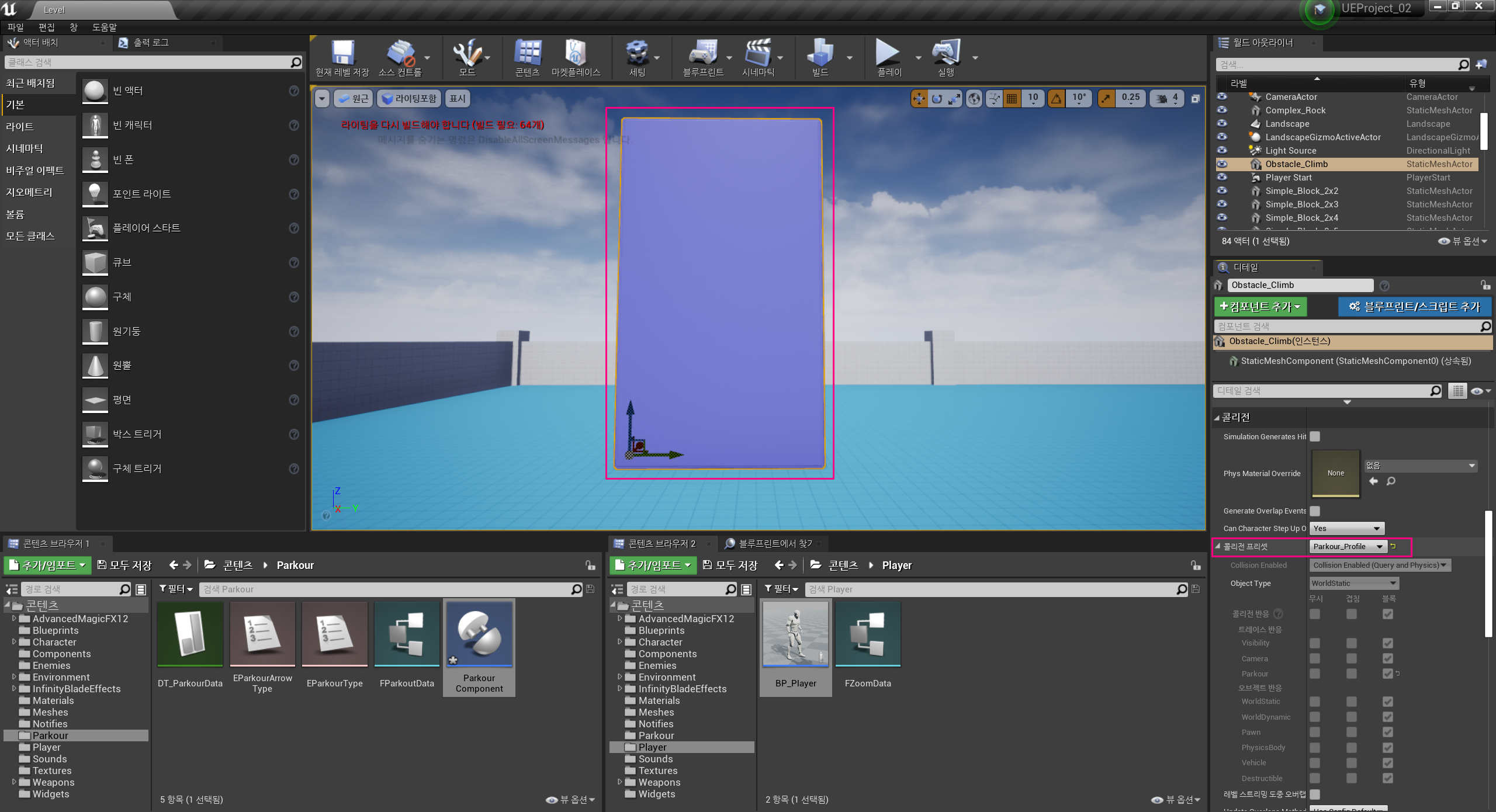 따라서 파쿠르가 가능한 액터의 콜리전 프리셋만 Parkour_Profile로 설정하면, 일반 벽은 파크루 충돌에서 제외되고, 해당 콜리전 프리셋이 적용된 액터에서만 충돌 검사를 수행하게 된다.