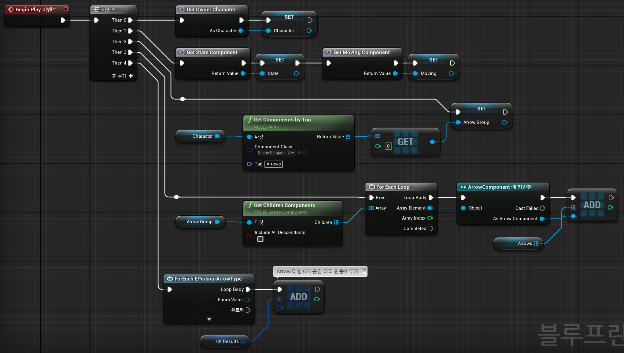 다섯 조건을 모두 만족하면 그 다음으로 파쿠르 장애물과 플레이어가 너무 틀어져있진 않은지 검사하는 블루프린트를 작성하였다.