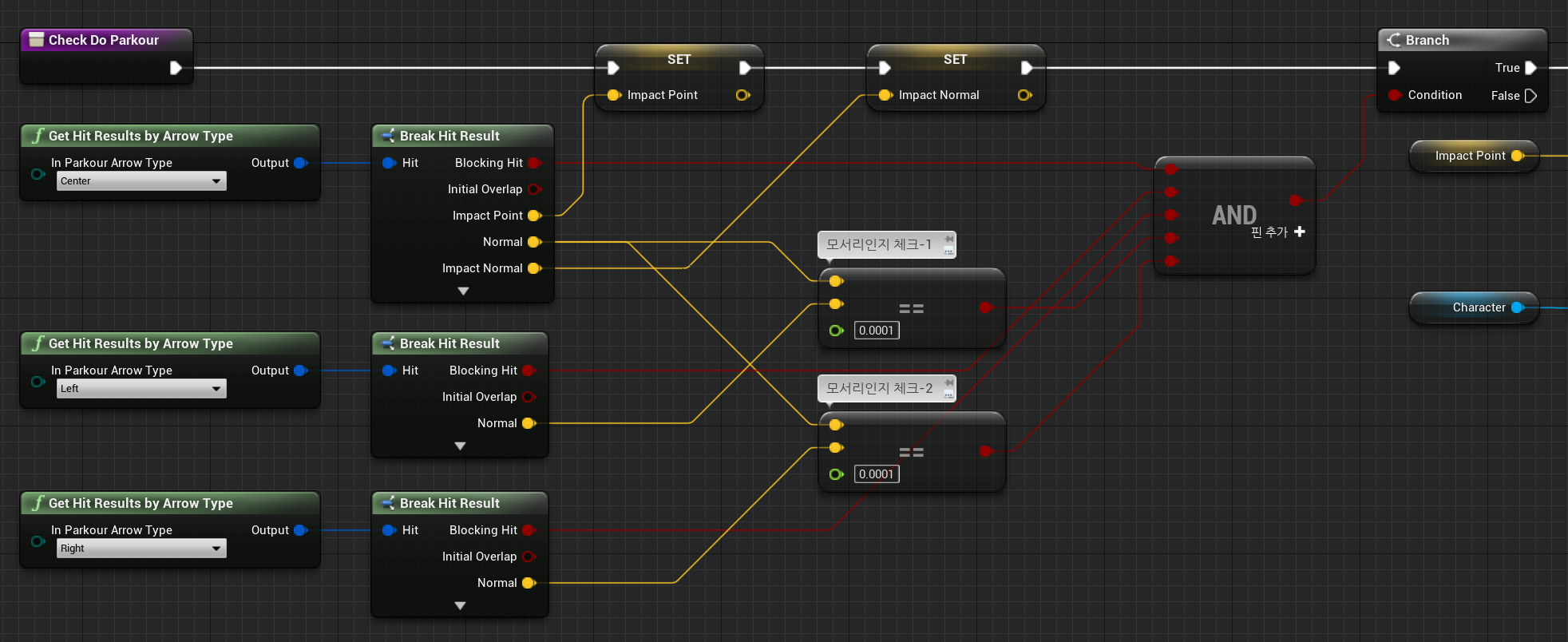 Check Do Parkour 함수의 조건은 총 6가지로, 3가지는 Center, Left, Right들의 Arrow가 파쿠르 장애물과 Hit 되어있는지 이다. 2가지는 플레이어가 파쿠르 장애물의 모서리에 위치하고 있지는 않은지를 검사하는 조건이다.