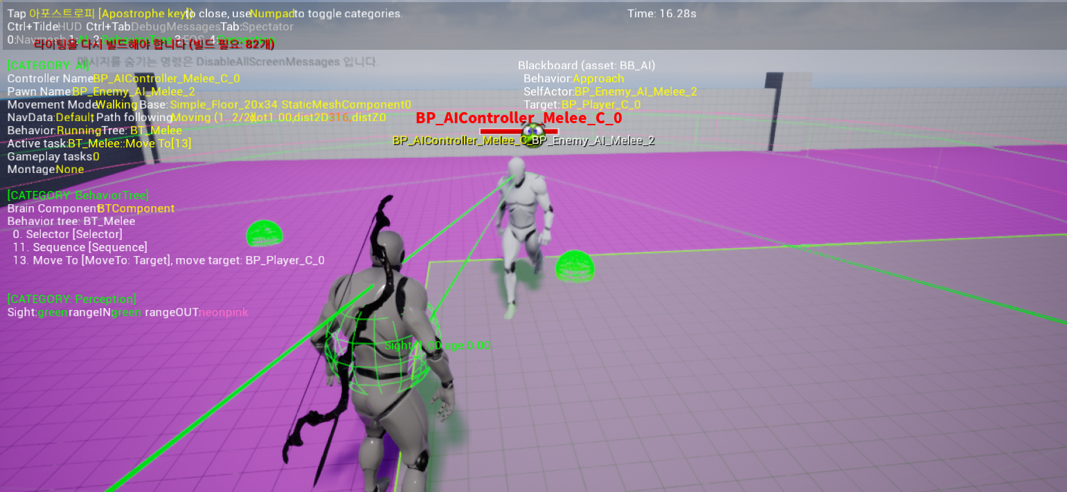 디버그 모드에서 AI의 상태와 비헤이비어 트리의 상태를 실시간으로 확인할 수 있고, 숫자패드 4번을 누르면 AI의 감지 범위가 출력된다.