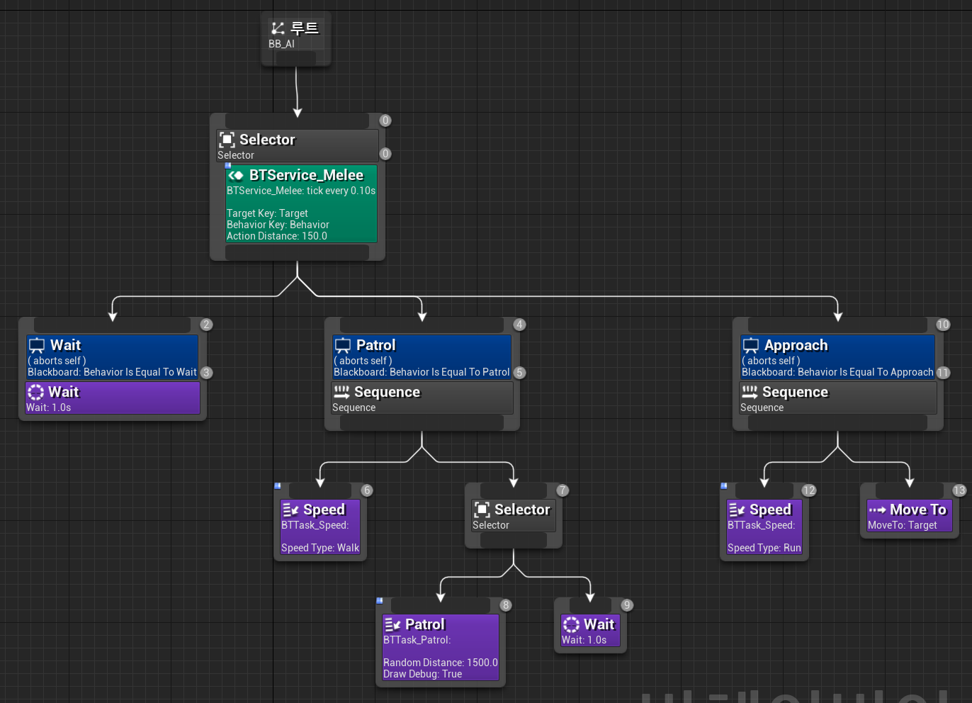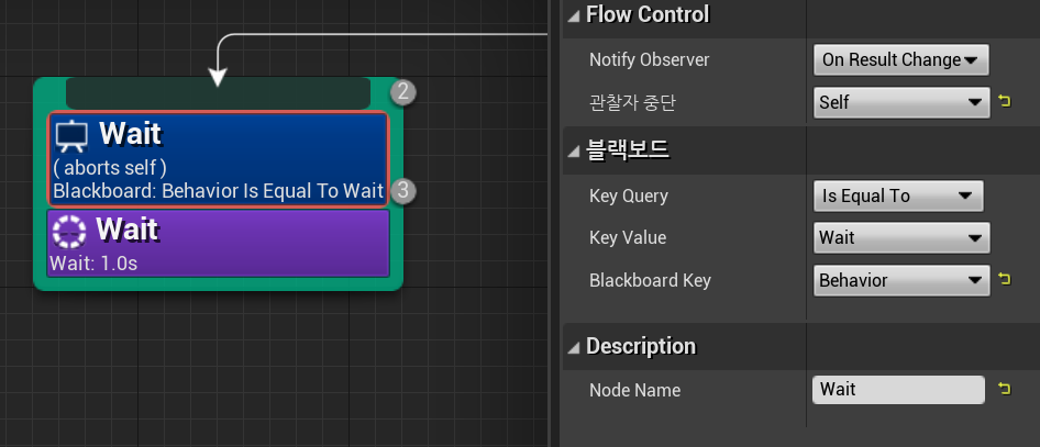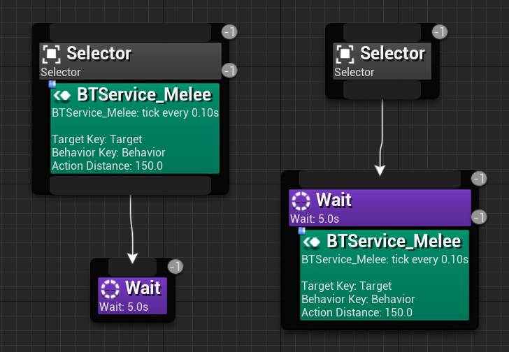 Behavior 키가 Wait과 같다면 Wait을 실행하게 된다. 이때 Wait을 실행하고 있는 도중에 Service_Melee에서 상태가 바뀌면, Wait에 할당된 시간이 전부 끝난 후에서야 Selector 노드로 돌아가게 된다.