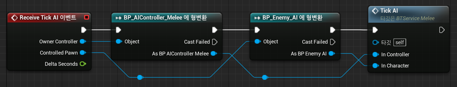 BTService_Melee 클래스의 이벤트 그래프에서 Tick 이벤트를 호출시키고, 커스텀 함수인 Tick AI를 만들어주었다.