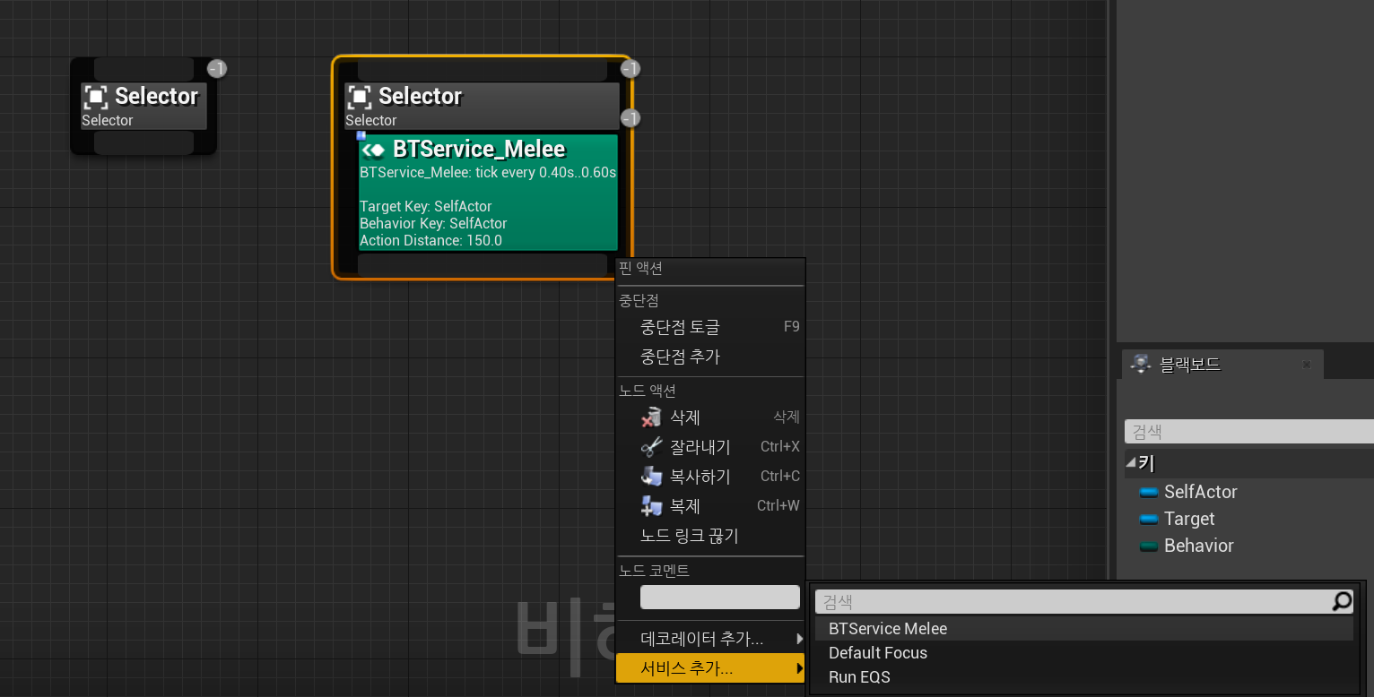 서비스 클래스를 만들고 나면, 비헤이비어 트리에서 서비스 추가 속성에 방금 만든 Class가 나타나게 된다.