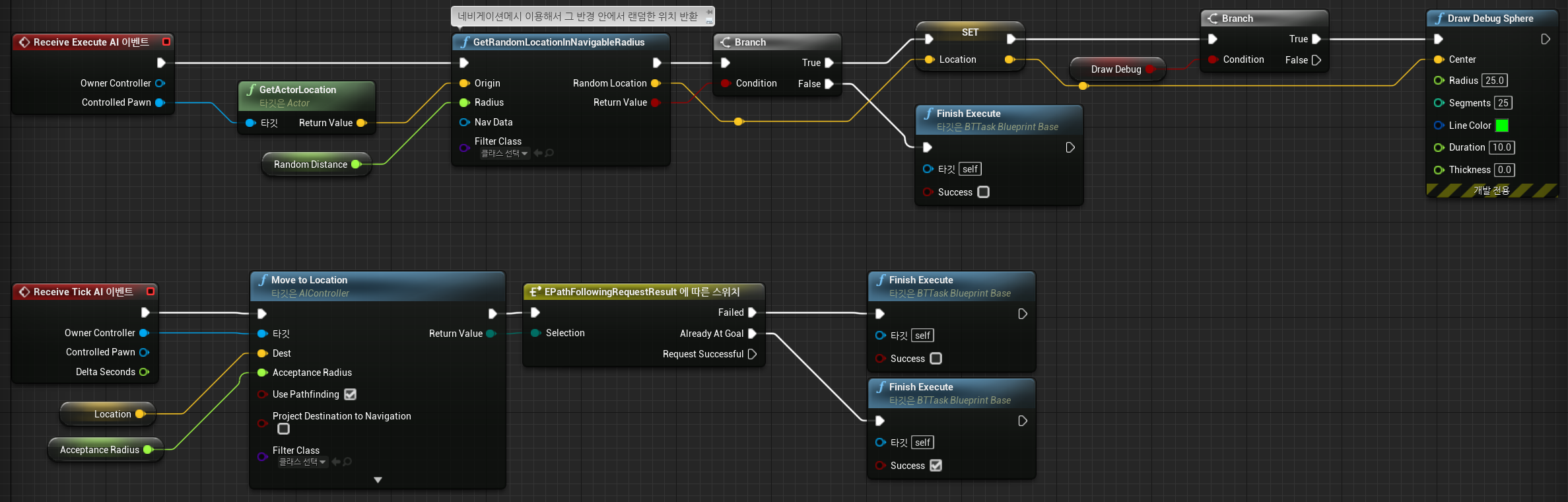Task가 실행될 때 Enemy의 위치에서부터 Get Random Location In Navigable Radius 함수를 통한 반경 내 랜덤한 위치 이동을 구현하였다.
