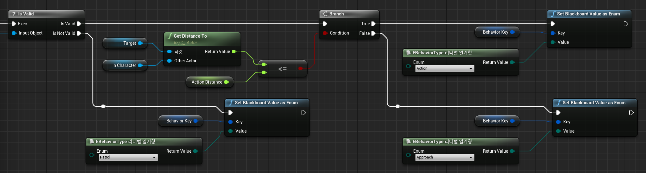 이후 Target이 감지되었다면 Target과 플레이어의 거리가 Action Distance(150) 이내라면 Action 상태로 변경해주었다.