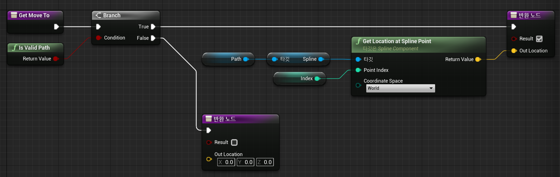 만들어두었던 Path 액터를 변수로 저장하여 Path 액터가 존재한다면, 해당하는 제어점(Index)의 Spline Point로 이동하는 Get Move To 함수를 작성하였다.