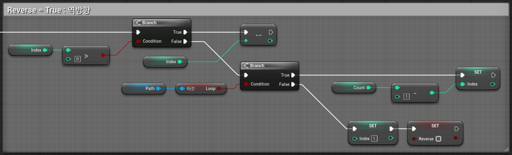 Reverse가 True라면 역방향이기 때문에 현재 인덱스가 0보다 크다면 계속 -- 감소시키고, 0과 같아진 경우 Loop 라면 끝 인덱스로 바로 이동하고, Loop 가 아니라면 인덱스 1로 이동하고 정방향으로 돌아가도록 Reverse를 반전시켜주었다.