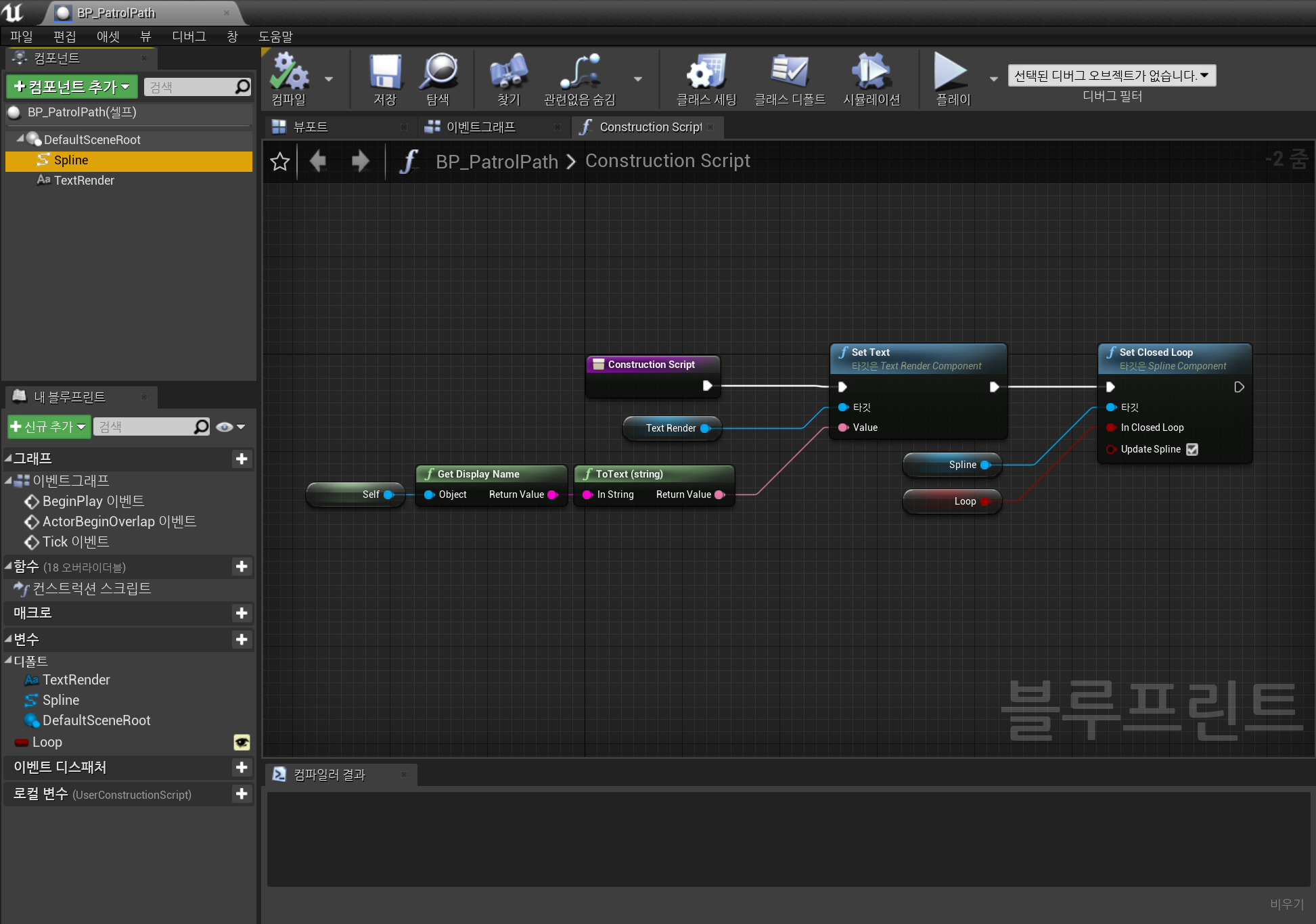 Construction Script는 액터가 생성될 때, 뷰포트에 배치될 때, 멤버변수가 하나라도 값이 변경될 때 호출된다. 해당 스크립트에서 현재 클래스 Name을 TextRender로 출력하고, Spline 컴포넌트 안에 Set Closed Loop 함수를 호출하였다.