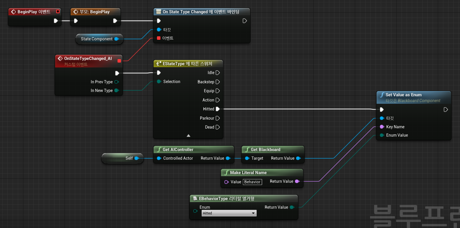 Enemy AI의 부모 클래스인 BP_Enemy_AI에 State가 Hitted로 변경될 때마다 Behavior Type을 Hitted로 바꾸는 코드가 작성되어있기 때문에, 플레이어가 Enemy를 공격하면 비헤이비어 트리의 Hitted 노드가 실행된다.