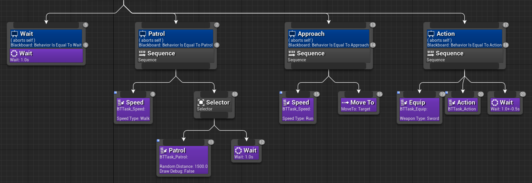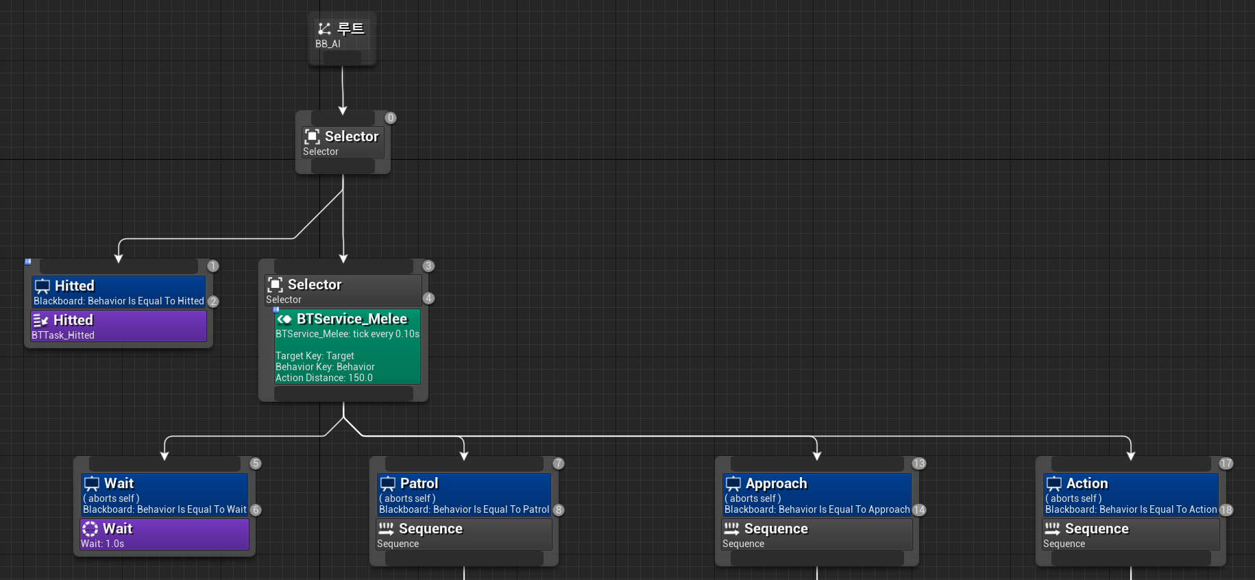 데미지를 입는 Hitted는 맞는 순간 모든 행동이 초기화된다. 따라서 루트 노드 바로 다음에 가장먼저 Hitted 상태인지를 판단하도록 비헤이비어 트리 구조를 작성하였다.