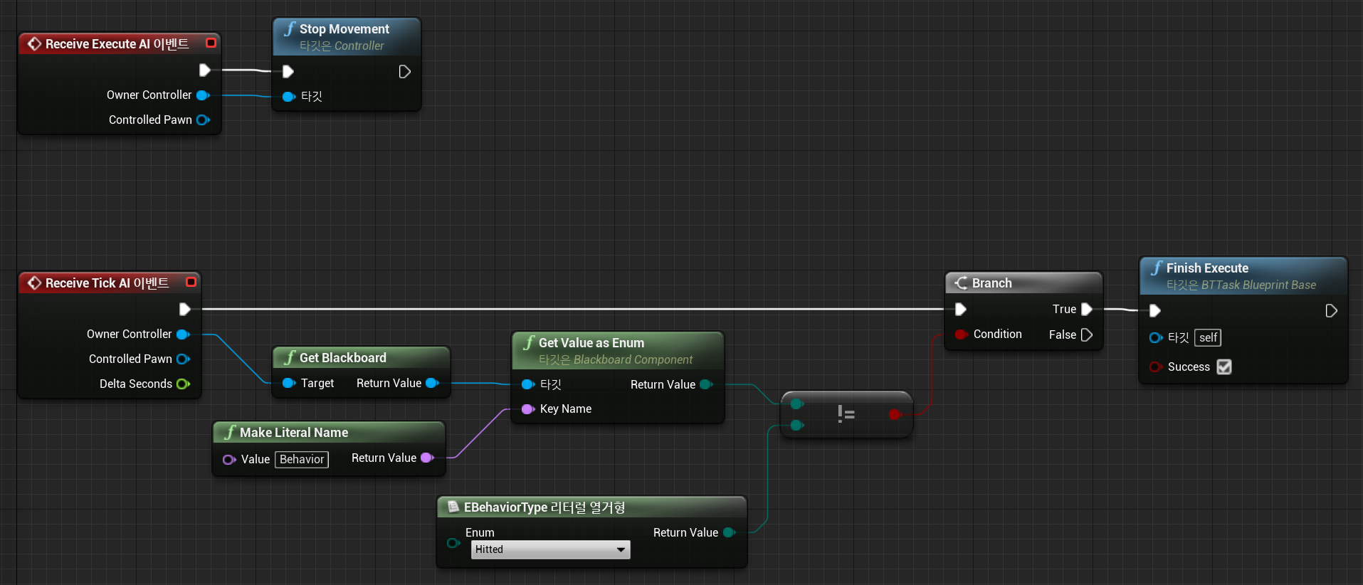 Hitted Task가 실행되면 움직일 수 없도록 Stop Movement를 호출하고, 블랙보드의 Behavior Type을 Hitted 상태가 아닌 경우 Task를 성공으로 탈출하도록 구현하였다.