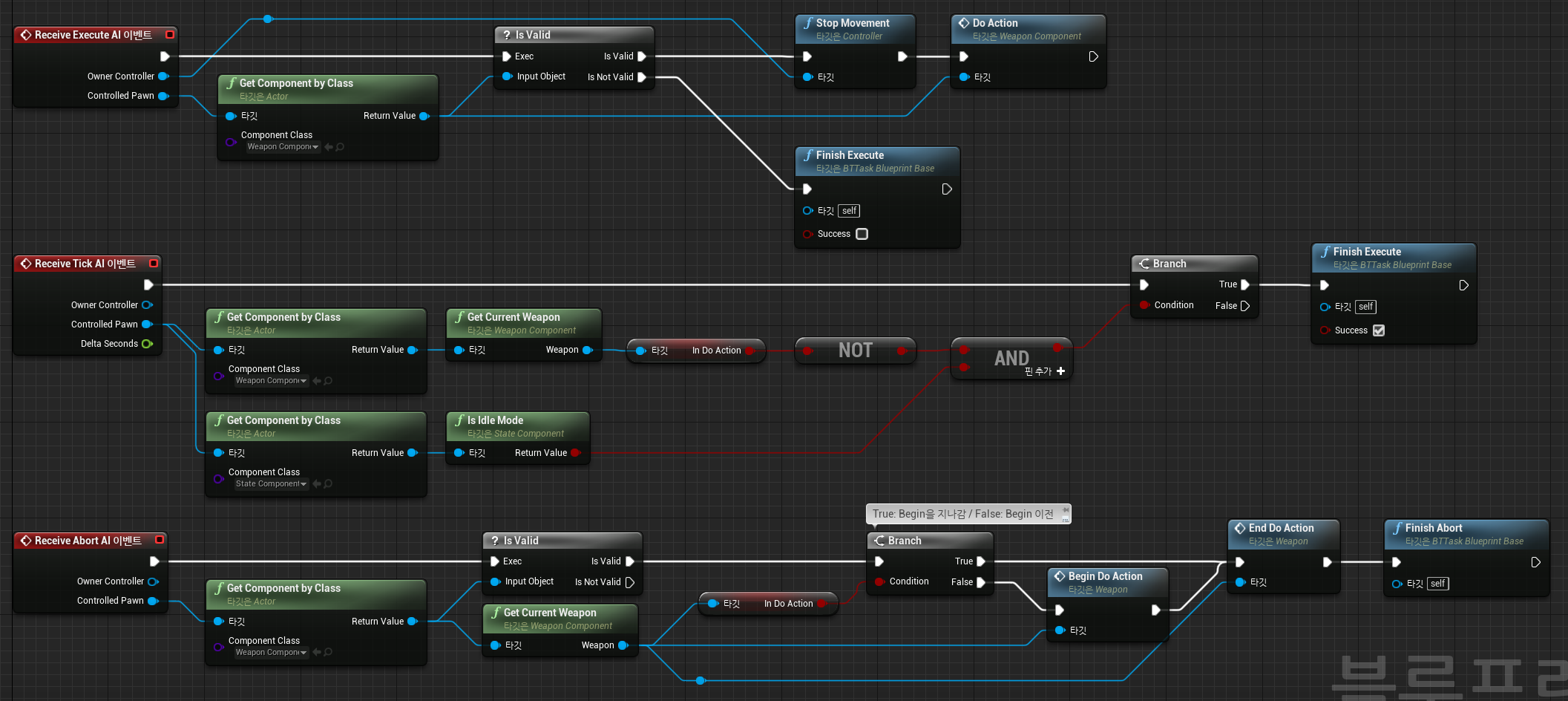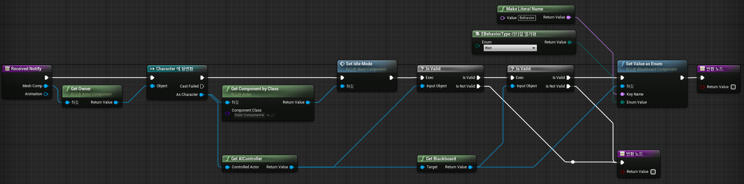 Equip과 마찬가지로 Action 몽타주가 실행되고 End Action까지 진행되었는지를 판단하고, Action 도중에 플레이어에게 공격받거나 하여 중단되면 강제로 Action을 종료해주었다.