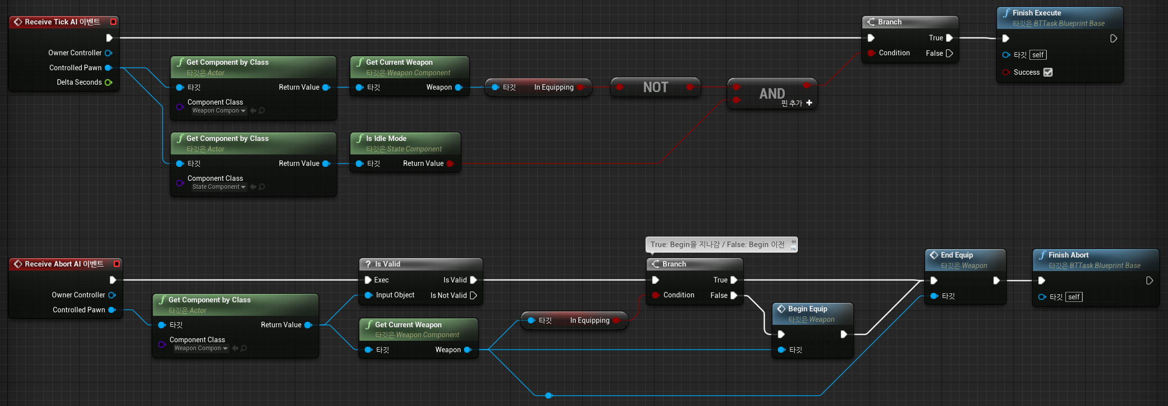만약 Enemy의 Equip 과정 도중에 플레이어가 공격을 하면 Equip 몽타주가 끝까지 실행되지 않고 중단되어 End Equip이 호출되지 않는다. 그렇다면 Tick AI에서 비교하는 조건문들에 평-생 만족하지 못할것이다.