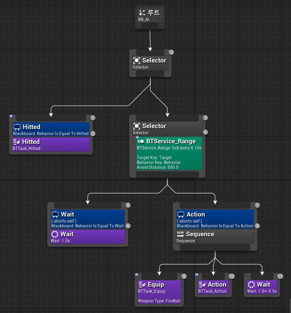 장거리 AI는 순찰이나 추적기능을 전부 제외하고, 위치에 서있다가 범위에 들어오면 플레이어를 공격하고, 가까워지면 회피하는 구조로 구현하였기 때문에 비헤이비어 트리도 위와 같이 작성하였다.