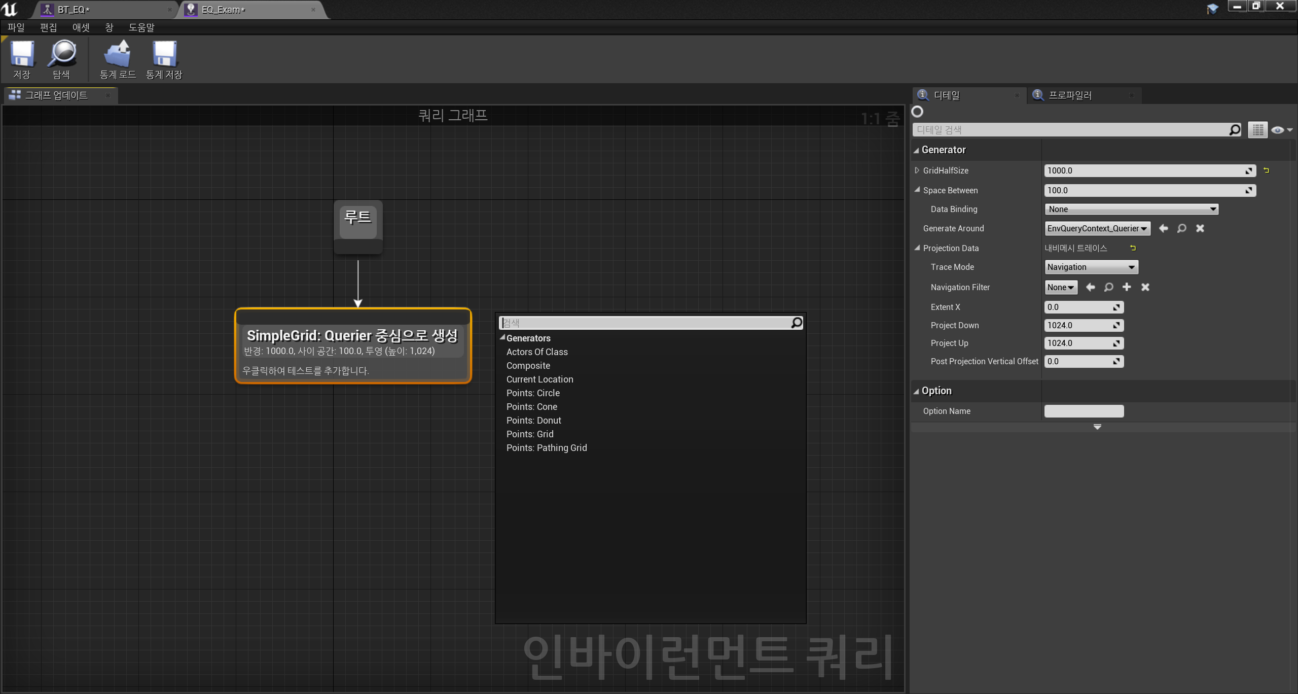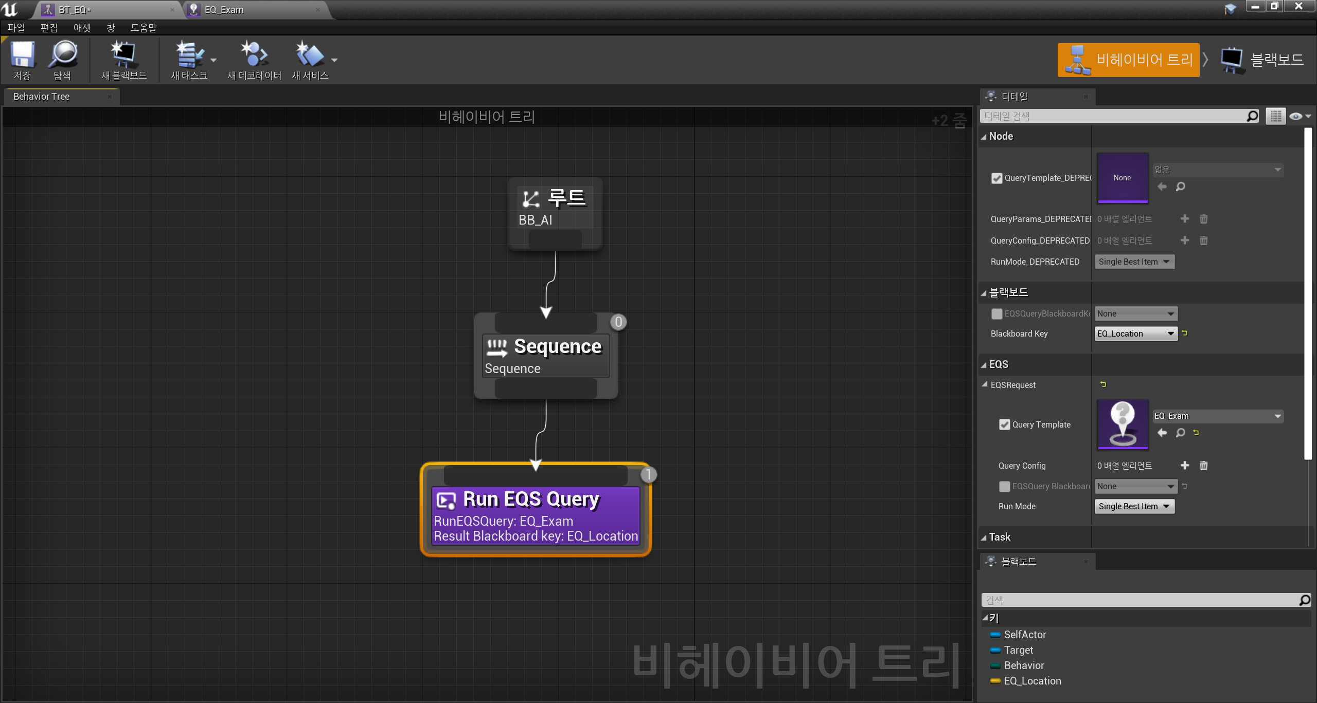 EQ를 구현할 비헤이비어 트리에서 EQS 쿼리를 수행하는 Run EQS Query 노드를 추가하였다.