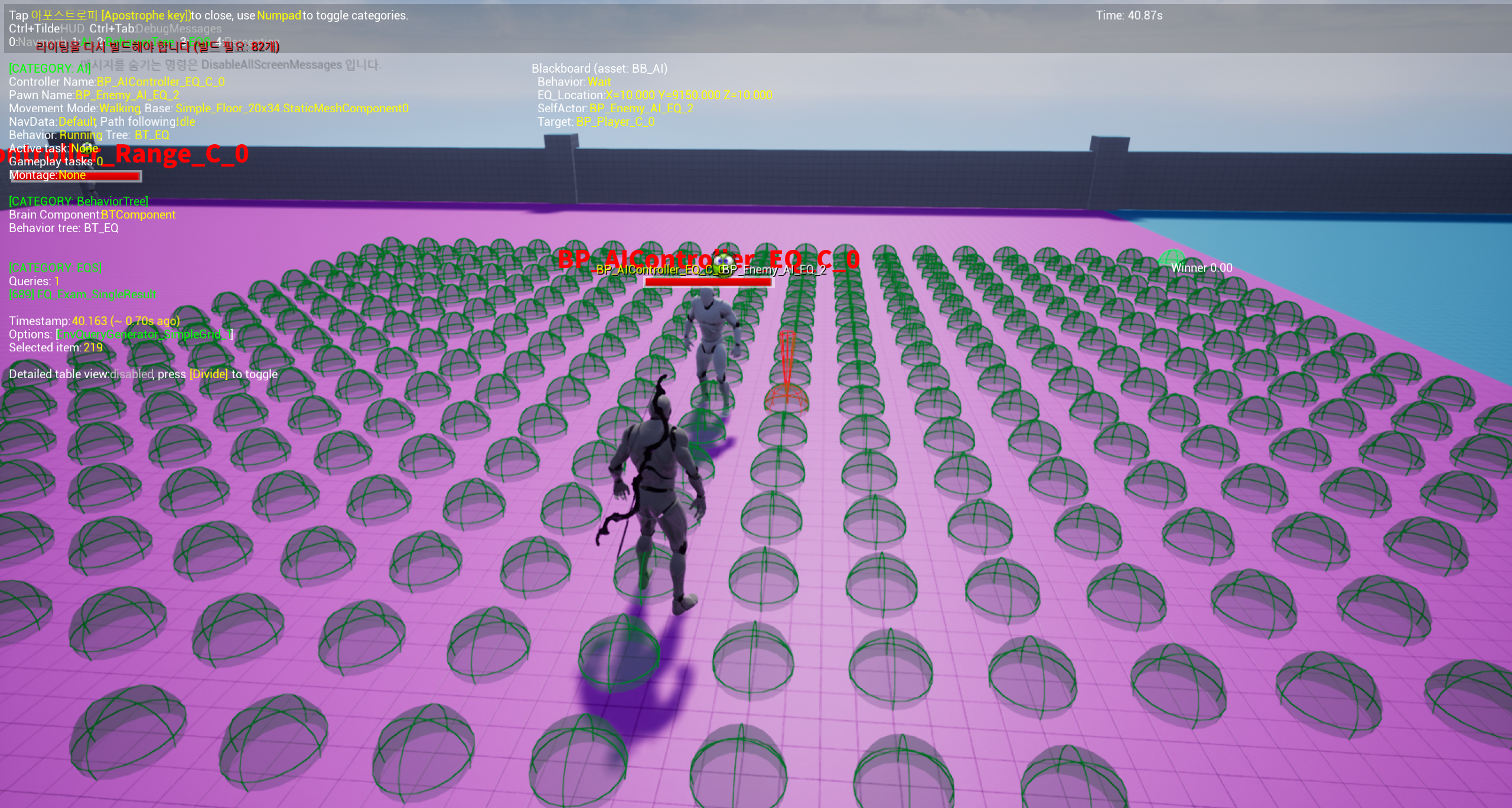 이렇게 만들어놓은 EQ 비헤이비어 트리를 적용시킨 Enemy_AI_EQ를 뷰포트에 배치하고, 디버그모드( ' )를 실행시킨 후 숫자패드 3번을 누르면 EQS 디버그 모드가 시작된다.