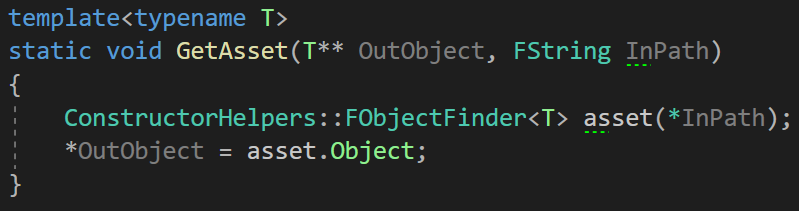 에셋을 가져올 땐 ConstructorHelpers 클래스 안에 있는 FObjectFinder 함수를 이용한다. 매개변수로 에셋이 존재하는 경로를 넣어 사용할 수 있다.