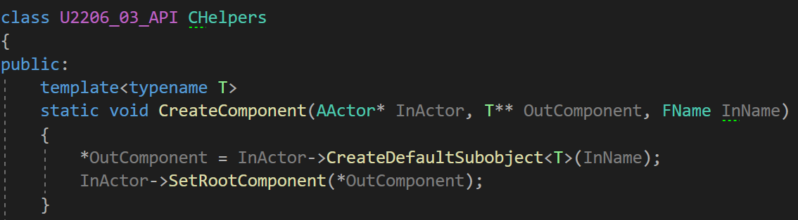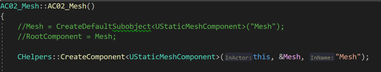컴포넌트 생성은 CreateDefaultSubobject 함수를 이용하여 생성할 수 있고, 매개변수로 컴포넌트의 이름이 들어간다.