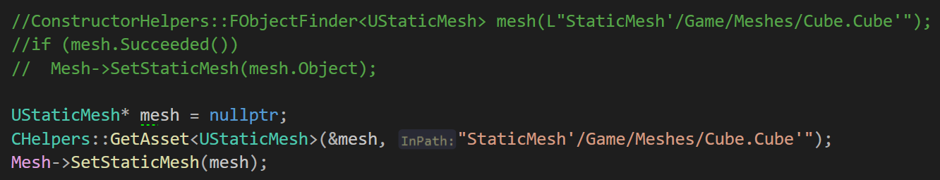 프로젝트 내에 에셋을 불러와 Mesh로 가져오는 과정 또한 컴포넌트 생성 함수처럼 템플릿화하여 함수로 만들었다.