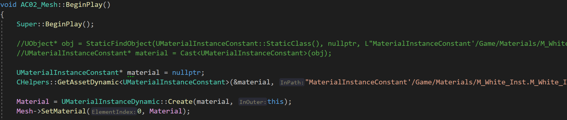 이전에 Mesh를 생성할 때는 ConstructorHelpers 클래스를 이용하여 ObjectFinder 함수를 사용했는데, Material은 동적으로 초기화되기 때문에 Constuctor 클래스를 사용하지 못한다. 말 그대로 ConstructorHelpers 클래스는 "초기화" 클래스이므로 생성자에서만 사용이 가능하기 때문이다.