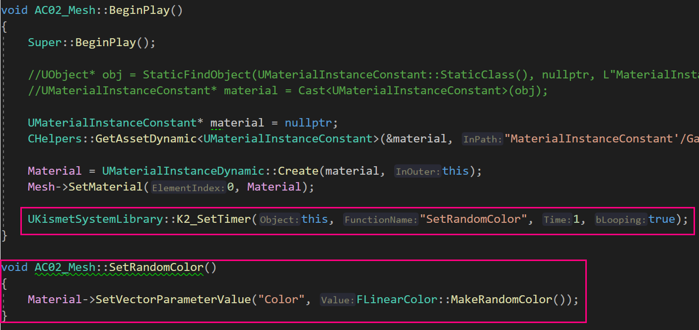 초기화해둔 Material의 SetVectorParameterValue 함수를 통해 Color값을 변경해주었는데, 이때 FLinearColor의 MakeRandomColor 함수를 이용하면 랜덤색상이 만들어져 반환된다.
