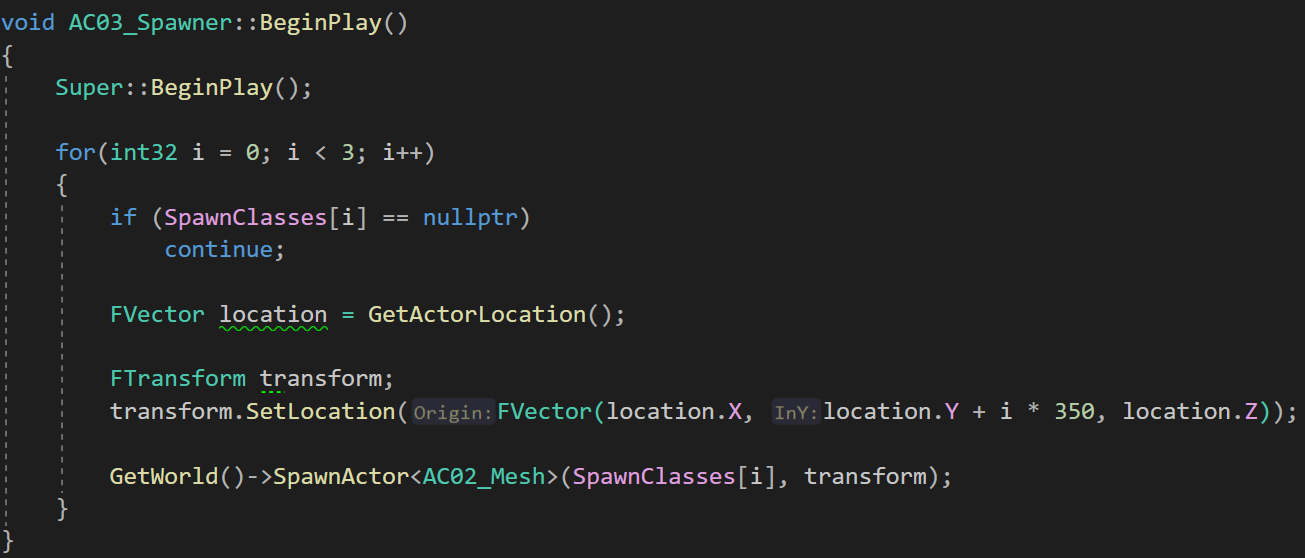 .cpp 파일에서는 배열의 크기(3) 만큼 for문을 돌리면서 SpawnClasses에 할당된 액터를 Spawn 시킨다.