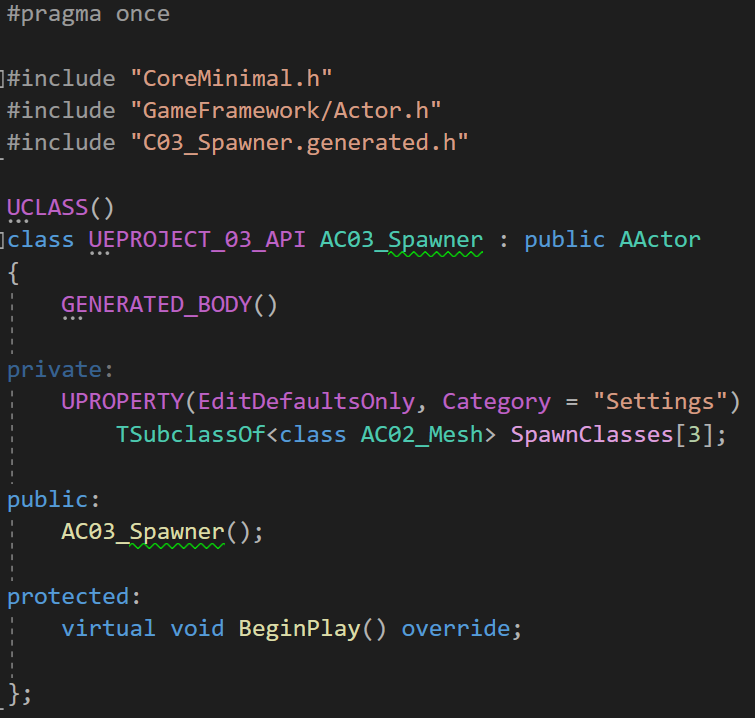 이때 Spawner 클래스에서 Spawn 시킬 클래스를 담는 SpawnClasses 배열 변수를 선언하였는데, 이때 사용한 TSubclassOf는 특정 클래스 이하의 클래스들만 범위로 나타내기 위함이다.